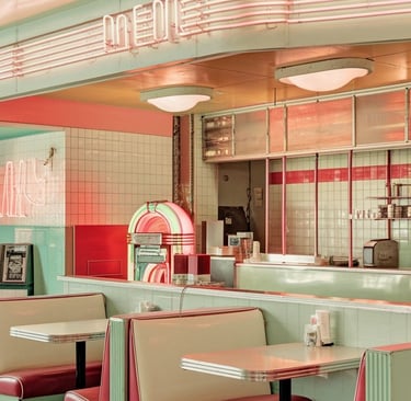 1980年代に入ると、ダイナー文化は新たな進化を遂げ、多くの人々に愛されました。この時期のダイナーは、鮮やかなネオンやカラフルな内装が特徴で、アメリカのポップカルチャーが反映される場所としても知られていました。特に、映画や音楽がダイナーのスタイルに大きな影響を与え、独特のレトロな感覚を持つ空間が形成されました。テーブルや椅子のデザインも、当時のトレンドを反映したもので、訪れた客に楽しい体験を提供しました。